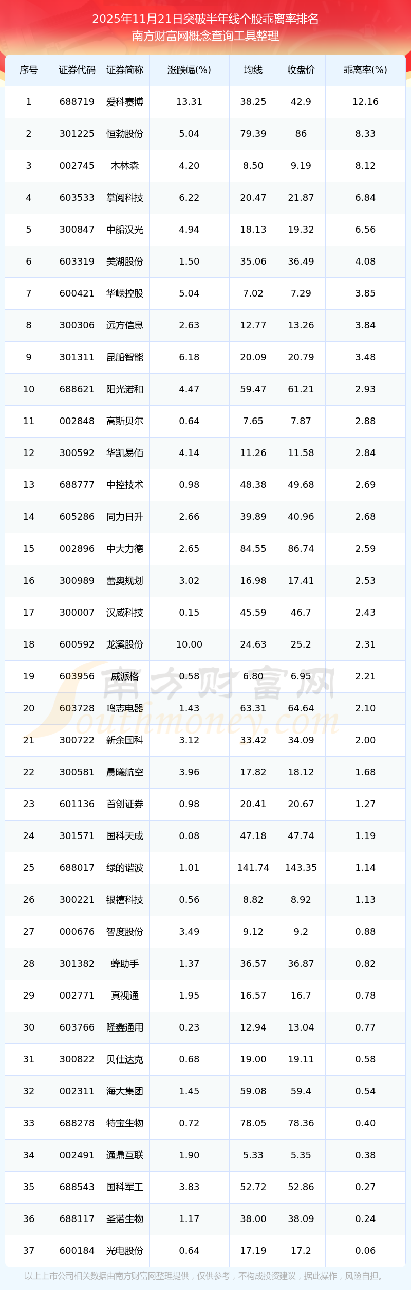 根據(jù)南方財富網(wǎng)概念查詢工具數(shù)據(jù)統(tǒng)計,截止2025年11月21日收盤,共有37只個股收盤價向上突破了半年線,其中乖離率較大的個股有愛科賽博、恒勃股份、木林森、掌閱科技、中船漢光等,乖離率分別為12.16%、8.33%、8.12%、6.84%、6.56%。