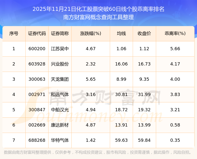 根據(jù)南方財(cái)富網(wǎng)概念查詢工具數(shù)據(jù)統(tǒng)計(jì),截止2025年11月21日收盤,化工股票共有7只個(gè)股收盤價(jià)向上突破了60日線。其中乖離率較大的個(gè)股有江蘇吳中、興業(yè)股份、天龍集團(tuán)等,乖離率分別為5.66%、4.17%、4.00%。