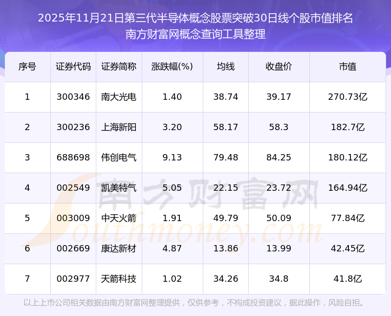 2025年11月21日第三代半導(dǎo)體概念股票突破30日線個(gè)股市值排名