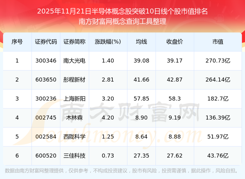 根據(jù)南方財(cái)富網(wǎng)概念查詢工具數(shù)據(jù)統(tǒng)計(jì),截止2025年11月21日收盤,半導(dǎo)體概念股共有6只個(gè)股收盤價(jià)向上突破了10日線。其中市值較大的個(gè)股有南大光電、彤程新材、上海新陽等,市值分別為270.73億、264.14億、182.7億。
