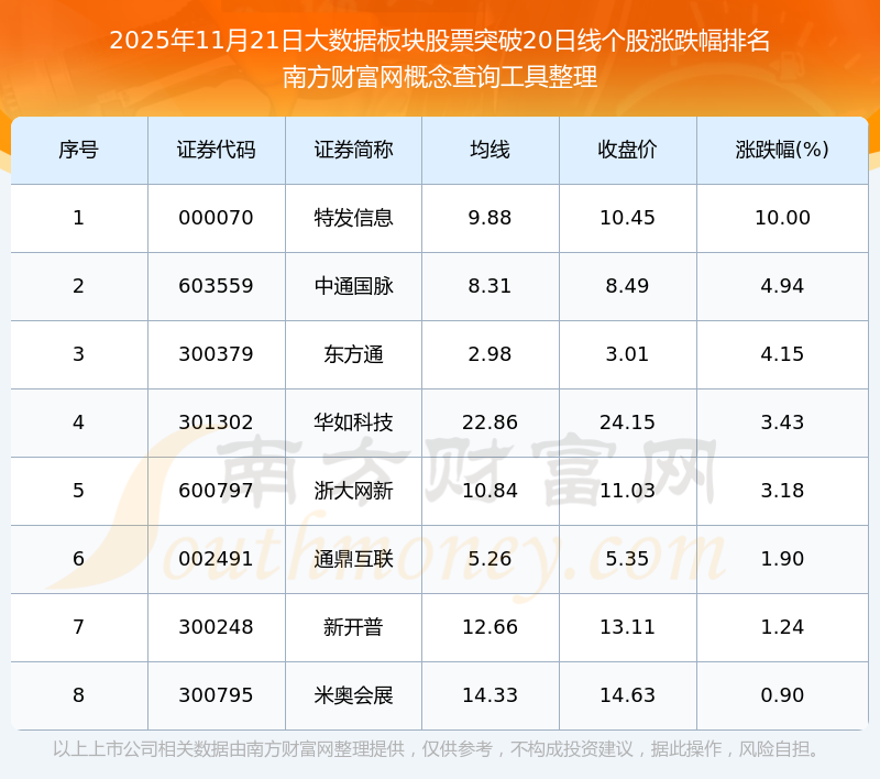2025年11月21日大數(shù)據(jù)板塊股票突破20日線個股漲跌幅排名