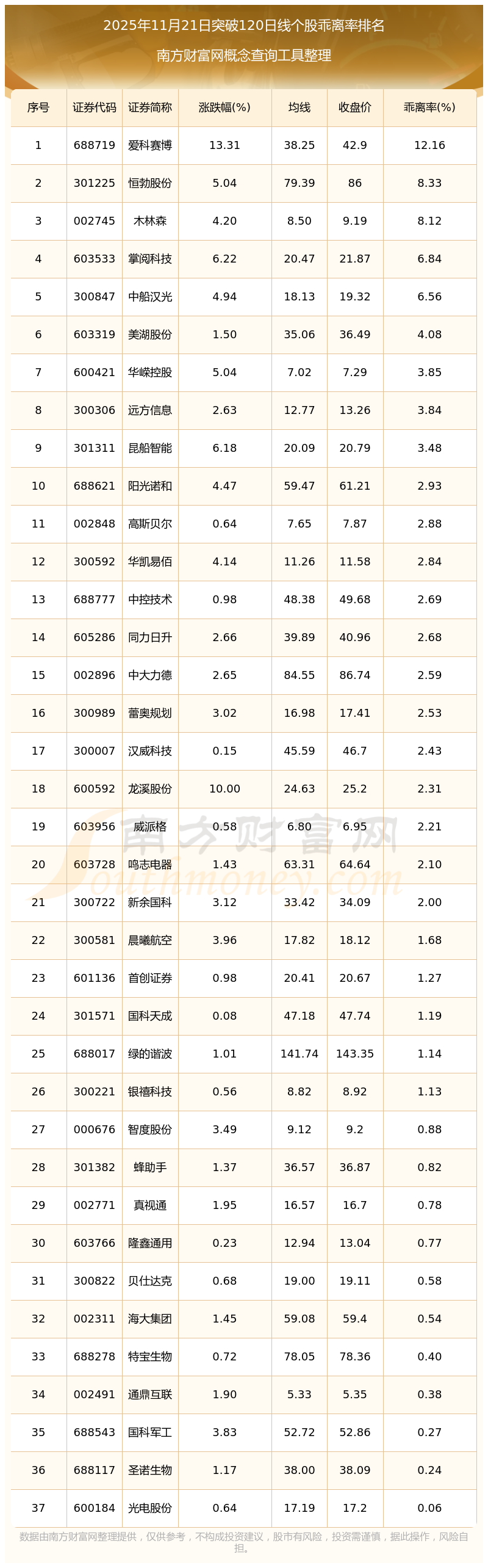 根據(jù)南方財富網(wǎng)概念查詢工具數(shù)據(jù)統(tǒng)計,截止2025年11月21日收盤,共有37只個股收盤價向上突破了120日線,其中乖離率較大的個股有愛科賽博、恒勃股份、木林森、掌閱科技、中船漢光等,乖離率分別為12.16%、8.33%、8.12%、6.84%、6.56%。
