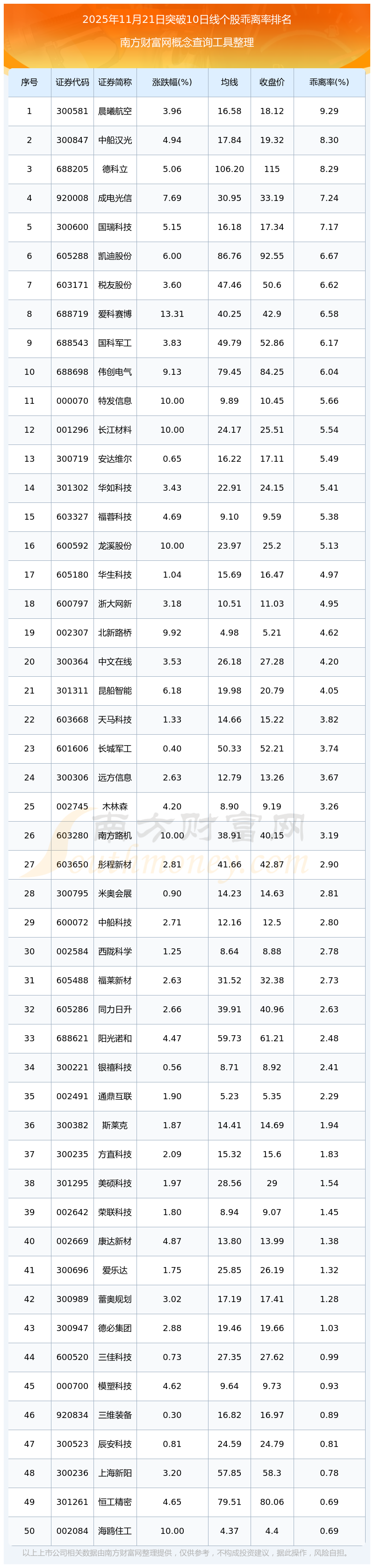 2025年11月21日突破10日線個(gè)股乖離率排名