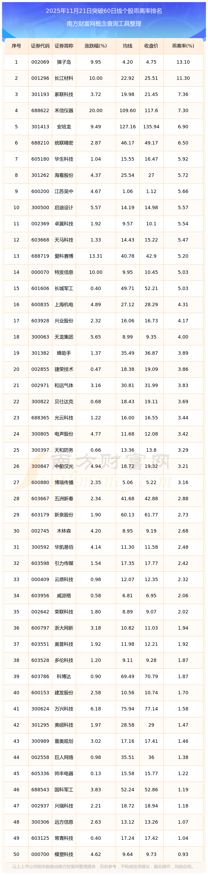 根據(jù)南方財富網概念查詢工具數(shù)據(jù)統(tǒng)計,截止2025年11月21日收盤,共有59只個股收盤價向上突破了60日線,其中乖離率較大的個股有獐子島、長江材料、家聯(lián)科技、禾信儀器、安培龍等,乖離率分別為13.10%、11.30%、7.36%、7.30%、6.90%。