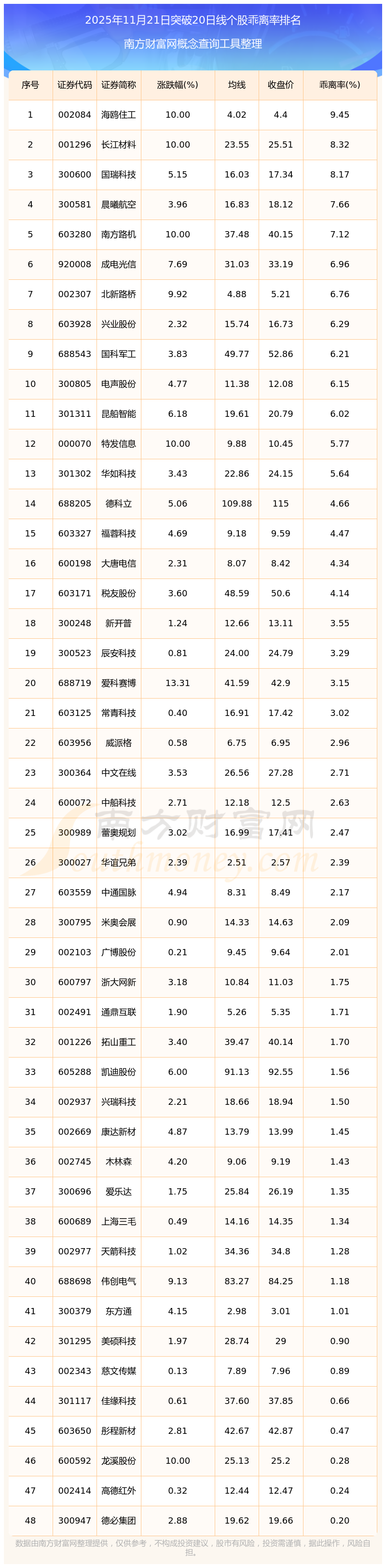 根據(jù)南方財富網(wǎng)概念查詢工具數(shù)據(jù)統(tǒng)計,截止2025年11月21日收盤,共有48只個股收盤價向上突破了20日線,其中乖離率較大的個股有海鷗住工、長江材料、國瑞科技、晨曦航空、南方路機等,乖離率分別為9.45%、8.32%、8.17%、7.66%、7.12%。