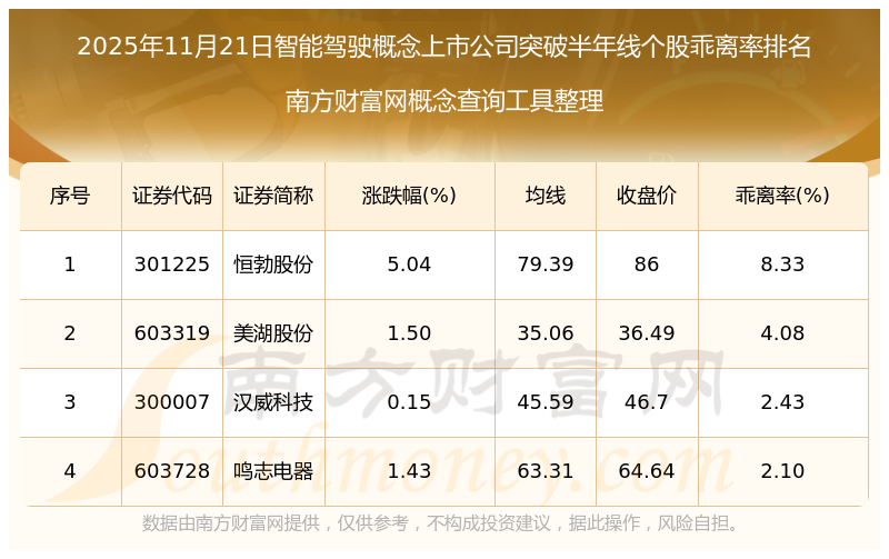 根據(jù)南方財富網(wǎng)概念查詢工具數(shù)據(jù)統(tǒng)計,截止2025年11月21日收盤,智能駕駛概念上市公司共有4只個股收盤價向上突破了半年線。其中乖離率較大的個股有恒勃股份、美湖股份、漢威科技等,乖離率分別為8.33%、4.08%、2.43%。
