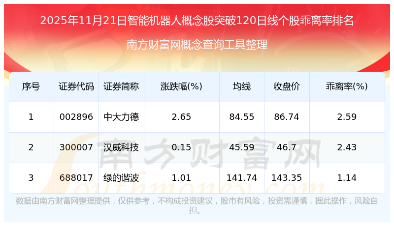 2025年11月21日智能機(jī)器人概念股突破120日線個(gè)股乖離率排名