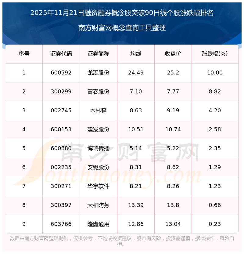 根據(jù)南方財(cái)富網(wǎng)概念查詢工具數(shù)據(jù)統(tǒng)計(jì),截止2025年11月21日收盤,融資融券概念股共有9只個(gè)股收盤價(jià)向上突破了90日線。其中漲幅較大的個(gè)股有龍溪股份、富春股份、木林森等,漲幅分別為10.00%、8.82%、4.20%。