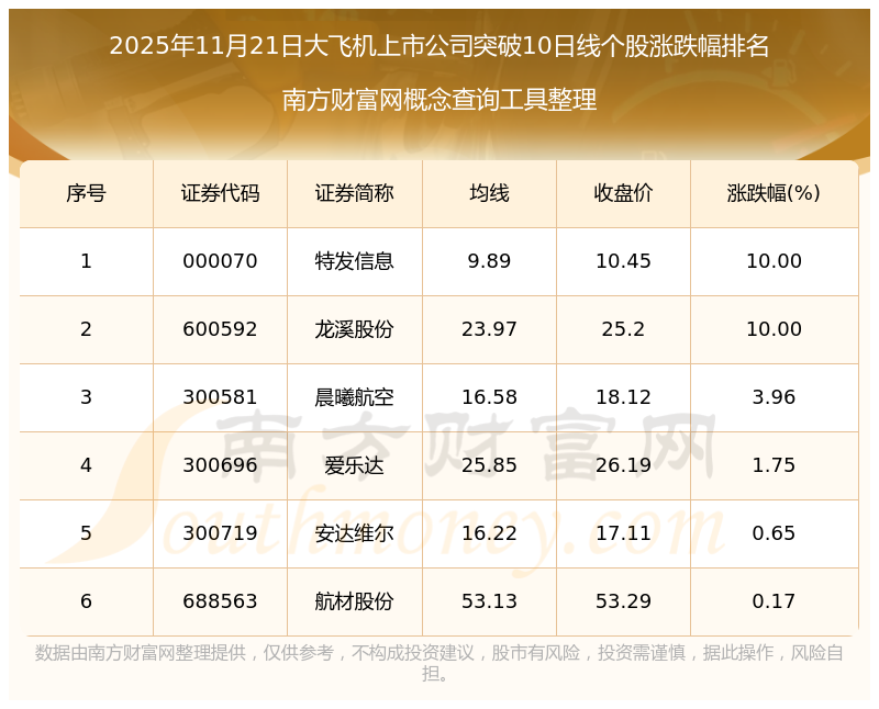 2025年11月21日大飛機(jī)上市公司突破10日線個(gè)股漲跌幅排名