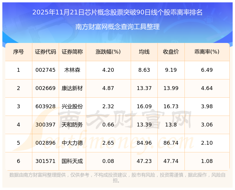 根據(jù)南方財(cái)富網(wǎng)概念查詢工具數(shù)據(jù)統(tǒng)計(jì),截止2025年11月21日收盤,芯片概念股票共有6只個股收盤價向上突破了90日線。其中乖離率較大的個股有木林森、康達(dá)新材、興業(yè)股份等,乖離率分別為6.49%、4.64%、3.98%。
