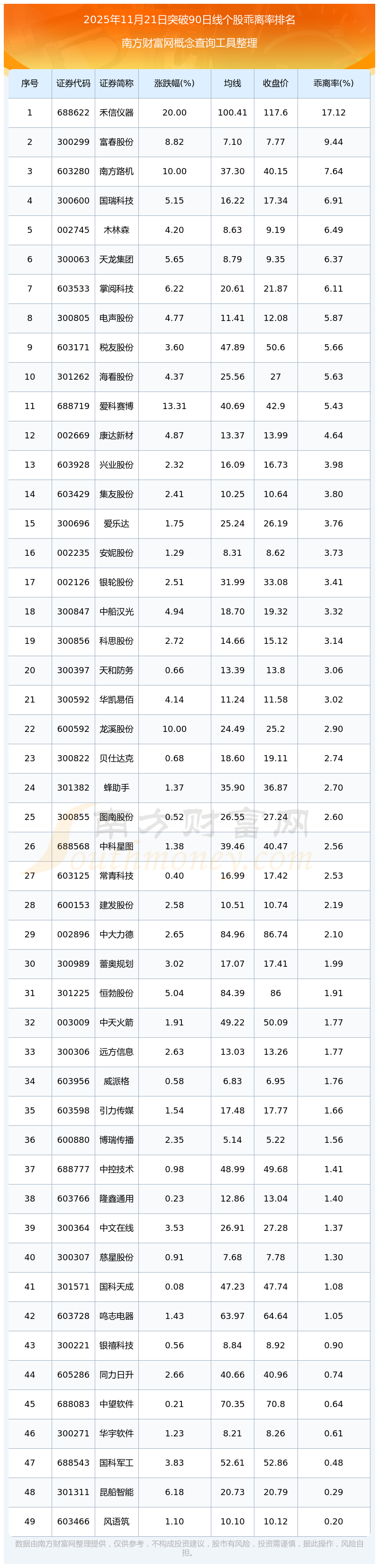2025年11月21日突破90日線個(gè)股乖離率排名