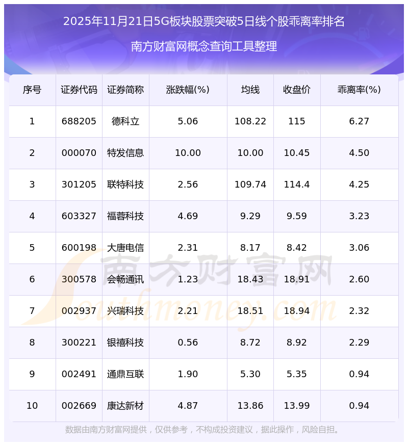 根據(jù)南方財富網(wǎng)概念查詢工具數(shù)據(jù)統(tǒng)計,截止2025年11月21日收盤,5G板塊股票共有13只個股收盤價向上突破了5日線。其中乖離率較大的個股有德科立、特發(fā)信息、聯(lián)特科技等,乖離率分別為6.27%、4.50%、4.25%。