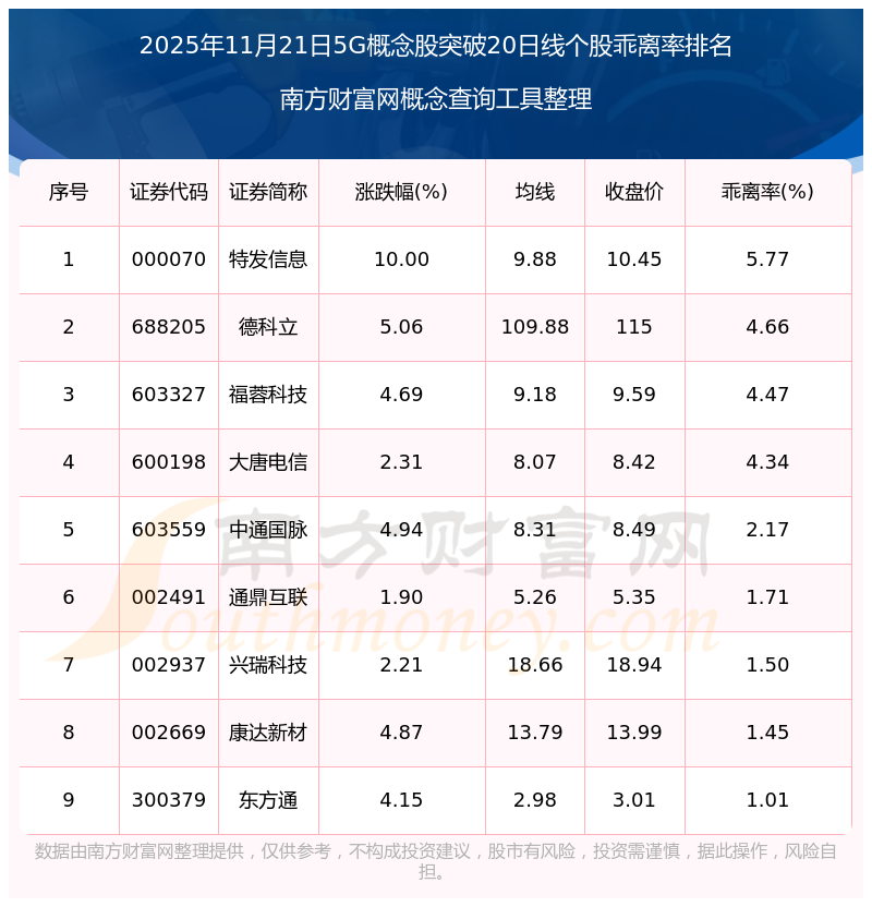 根據南方財富網概念查詢工具數據統(tǒng)計,截止2025年11月21日收盤,5G概念股共有9只個股收盤價向上突破了20日線。其中乖離率較大的個股有特發(fā)信息、德科立、福蓉科技等,乖離率分別為5.77%、4.66%、4.47%。