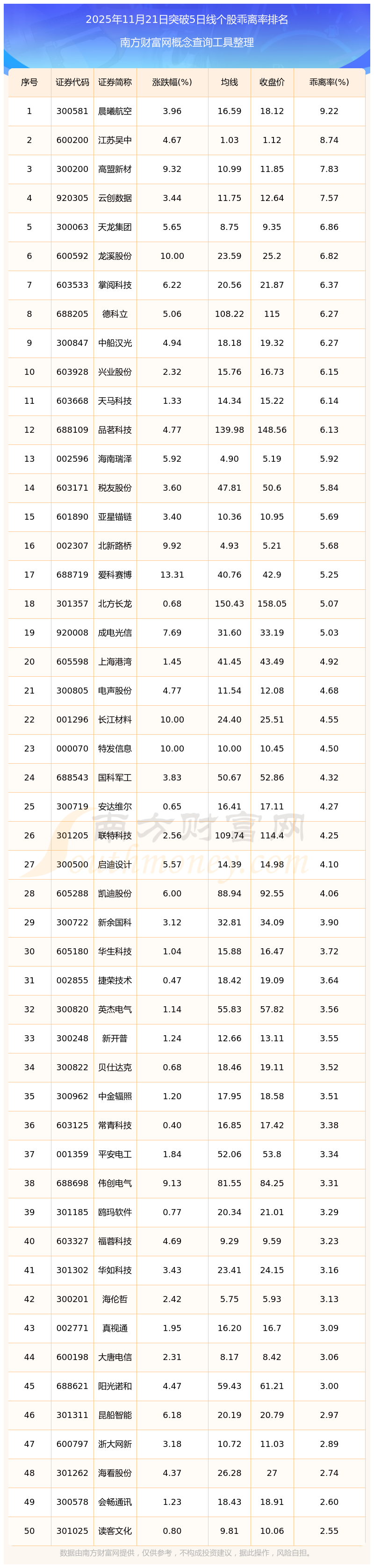 根據(jù)南方財富網(wǎng)概念查詢工具數(shù)據(jù)統(tǒng)計,截止2025年11月21日收盤,共有96只個股收盤價向上突破了5日線,其中乖離率較大的個股有晨曦航空、江蘇吳中、高盟新材、云創(chuàng)數(shù)據(jù)、天龍集團等,乖離率分別為9.22%、8.74%、7.83%、7.57%、6.86%。