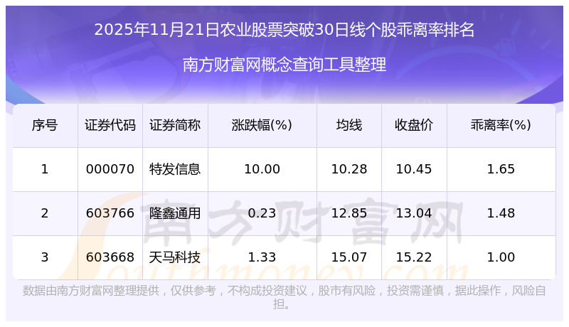 根據(jù)南方財富網(wǎng)概念查詢工具數(shù)據(jù)統(tǒng)計,截止2025年11月21日收盤,農(nóng)業(yè)股票共有3只個股收盤價向上突破了30日線。其中乖離率較大的個股有特發(fā)信息、隆鑫通用、天馬科技等,乖離率分別為1.65%、1.48%、1.00%。
