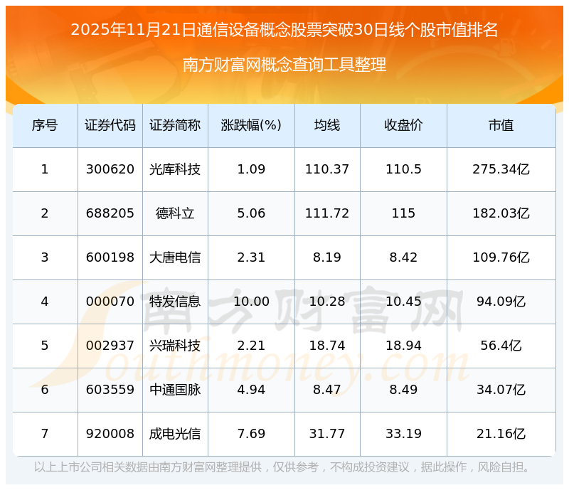 2025年11月21日通信設(shè)備概念股票突破30日線(xiàn)個(gè)股市值排名