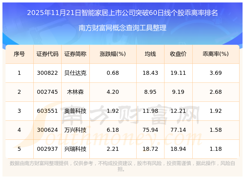 根據(jù)南方財富網(wǎng)概念查詢工具數(shù)據(jù)統(tǒng)計,截止2025年11月21日收盤,智能家居上市公司共有5只個股收盤價向上突破了60日線。其中乖離率較大的個股有貝仕達(dá)克、木林森、奧普科技等,乖離率分別為3.69%、2.68%、1.92%。