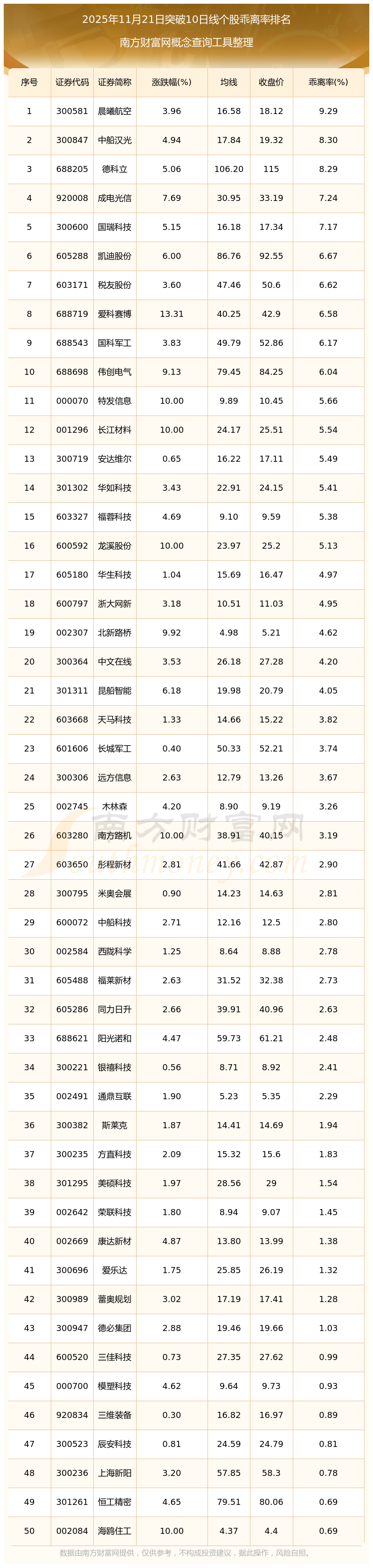 根據(jù)南方財富網(wǎng)概念查詢工具數(shù)據(jù)統(tǒng)計,截止2025年11月21日收盤,共有63只個股收盤價向上突破了10日線,其中乖離率較大的個股有晨曦航空、中船漢光、德科立、成電光信、國瑞科技等,乖離率分別為9.29%、8.30%、8.29%、7.24%、7.17%。