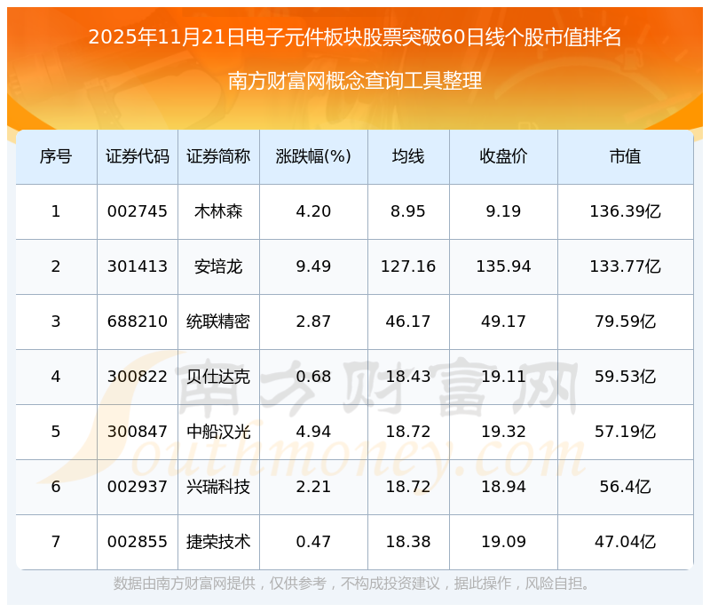 2025年11月21日電子元件板塊股票突破60日線個(gè)股市值排名