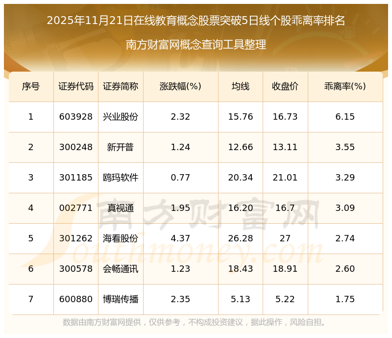 2025年11月21日在線教育概念股票突破5日線個股乖離率排名