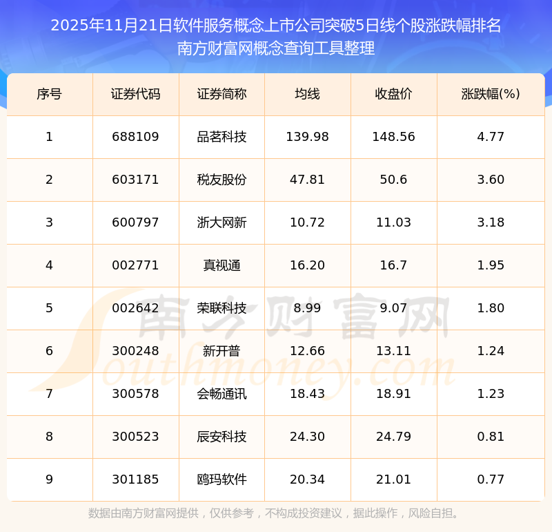 2025年11月21日軟件服務(wù)概念上市公司突破5日線個(gè)股漲跌幅排名