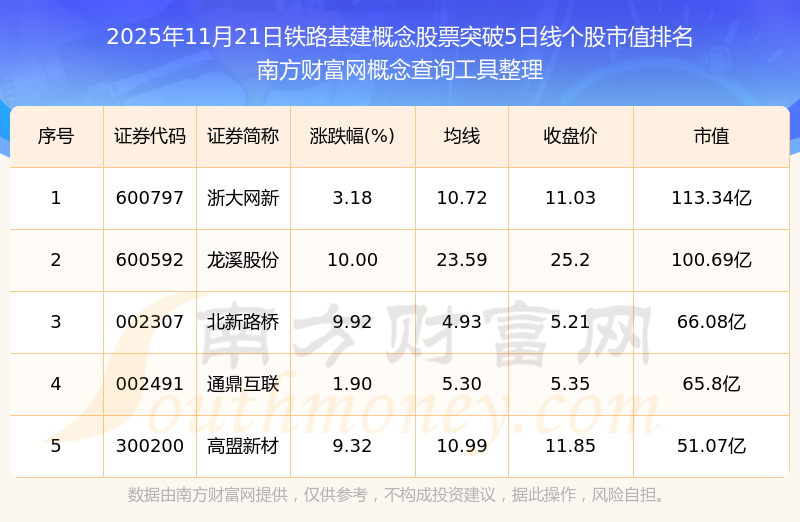 2025年11月21日鐵路基建概念股票突破5日線個(gè)股市值排名