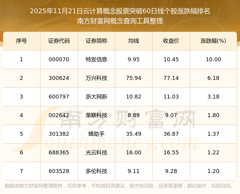 根據(jù)南方財富網(wǎng)概念查詢工具數(shù)據(jù)統(tǒng)計,截止2025年11月21日收盤,云計算概念股票共有7只個股收盤價向上突破了60日線。其中漲幅較大的個股有特發(fā)信息、萬興科技、浙大網(wǎng)新等,漲幅分別為10.00%、6.18%、3.18%。