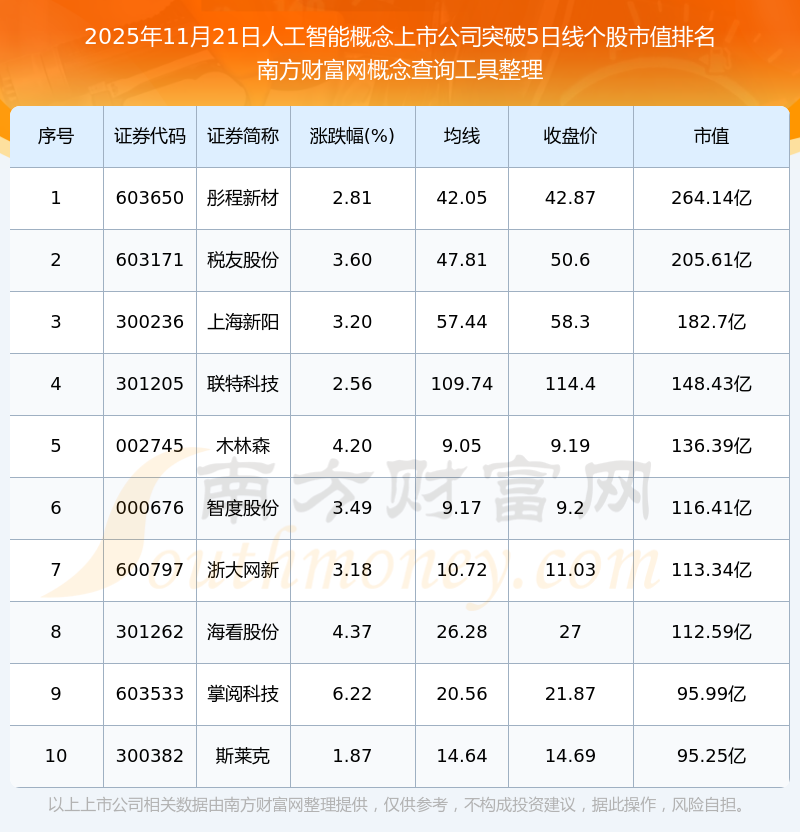 2025年11月21日人工智能概念上市公司突破5日線個(gè)股市值排名