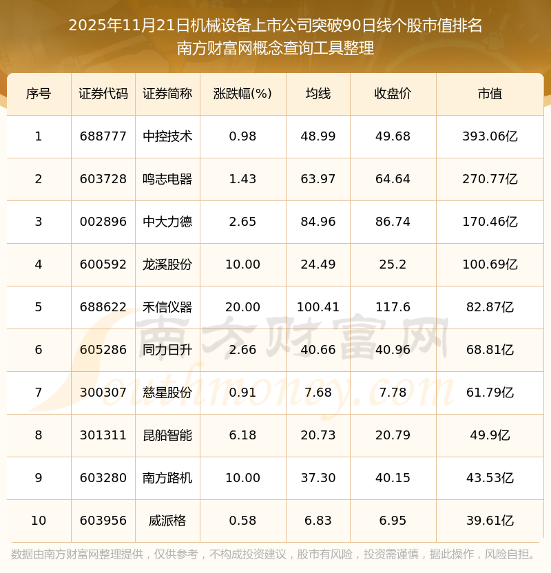 2025年11月21日機械設(shè)備上市公司突破90日線個股市值排名