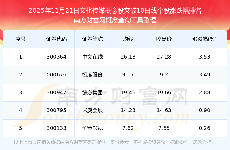 2025年11月21日文化傳媒概念股突破10日線個(gè)股漲跌幅排名