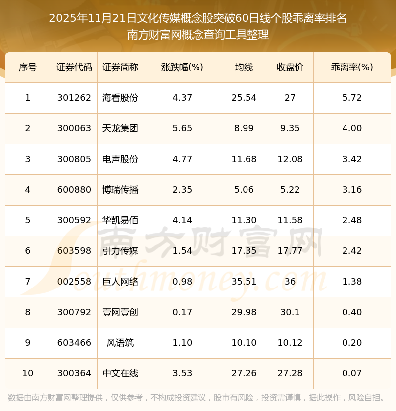 根據(jù)南方財(cái)富網(wǎng)概念查詢工具數(shù)據(jù)統(tǒng)計(jì),截止2025年11月21日收盤,文化傳媒概念股共有10只個(gè)股收盤價(jià)向上突破了60日線。其中乖離率較大的個(gè)股有?垂煞荨⑻忑埣瘓F(tuán)、電聲股份等,乖離率分別為5.72%、4.00%、3.42%。