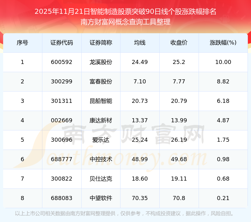 根據(jù)南方財富網(wǎng)概念查詢工具數(shù)據(jù)統(tǒng)計,截止2025年11月21日收盤,智能制造股票共有8只個股收盤價向上突破了90日線。其中漲幅較大的個股有龍溪股份、富春股份、昆船智能等,漲幅分別為10.00%、8.82%、6.18%。