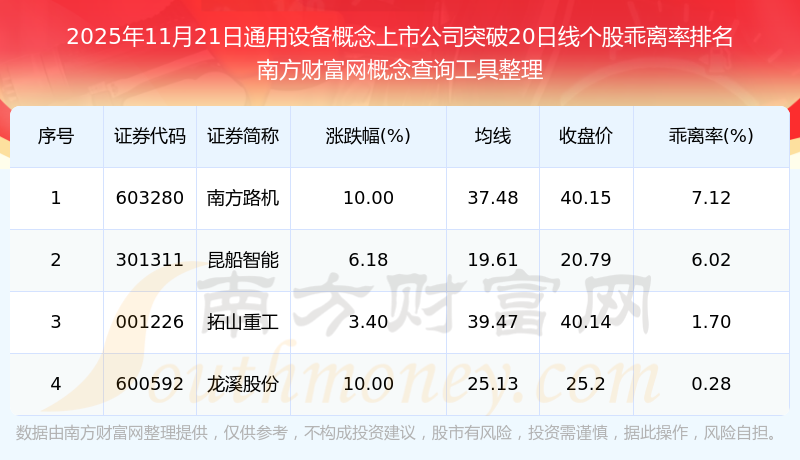 根據(jù)南方財(cái)富網(wǎng)概念查詢工具數(shù)據(jù)統(tǒng)計(jì),截止2025年11月21日收盤,通用設(shè)備概念上市公司共有4只個(gè)股收盤價(jià)向上突破了20日線。其中乖離率較大的個(gè)股有南方路機(jī)、昆船智能、拓山重工等,乖離率分別為7.12%、6.02%、1.70%。