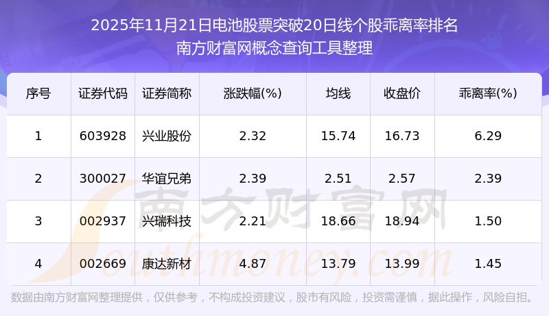 根據(jù)南方財富網(wǎng)概念查詢工具數(shù)據(jù)統(tǒng)計,截止2025年11月21日收盤,電池股票共有4只個股收盤價向上突破了20日線。其中乖離率較大的個股有興業(yè)股份、華誼兄弟、興瑞科技等,乖離率分別為6.29%、2.39%、1.50%。