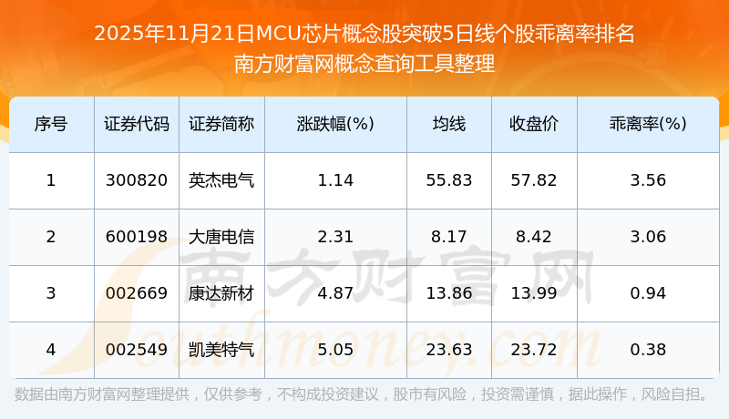 根據(jù)南方財富網(wǎng)概念查詢工具數(shù)據(jù)統(tǒng)計,截止2025年11月21日收盤,MCU芯片概念股共有4只個股收盤價向上突破了5日線。其中乖離率較大的個股有英杰電氣、大唐電信、康達新材等,乖離率分別為3.56%、3.06%、0.94%。