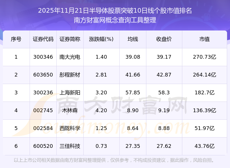 根據(jù)南方財富網(wǎng)概念查詢工具數(shù)據(jù)統(tǒng)計,截止2025年11月21日收盤,半導體股票共有6只個股收盤價向上突破了10日線。其中市值較大的個股有南大光電、彤程新材、上海新陽等,市值分別為270.73億、264.14億、182.7億。