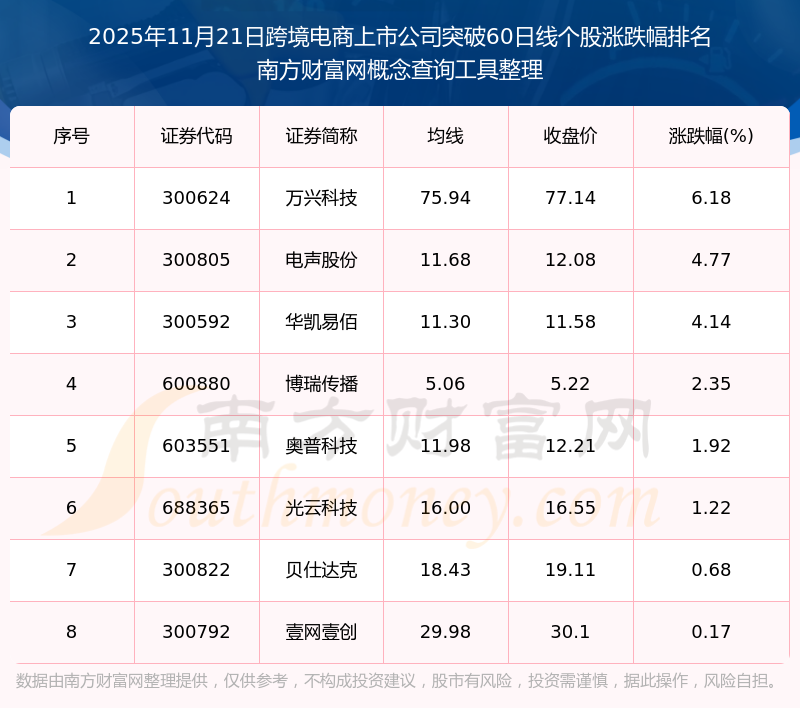 2025年11月21日跨境電商上市公司突破60日線個股漲跌幅排名