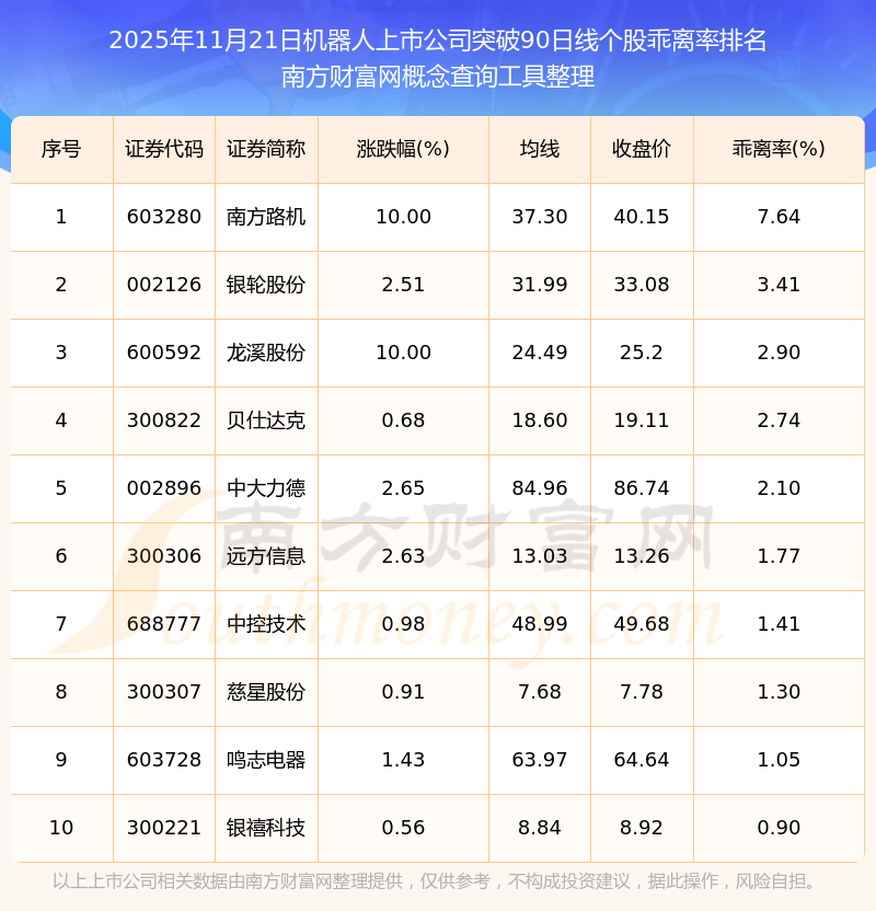 根據(jù)南方財富網(wǎng)概念查詢工具數(shù)據(jù)統(tǒng)計,截止2025年11月21日收盤,機器人上市公司共有11只個股收盤價向上突破了90日線。其中乖離率較大的個股有南方路機、銀輪股份、龍溪股份等,乖離率分別為7.64%、3.41%、2.90%。