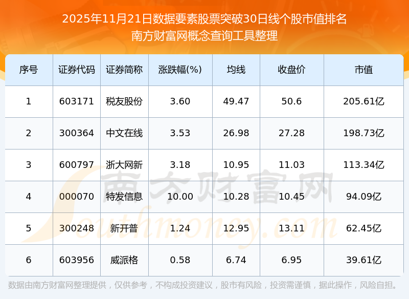 2025年11月21日數(shù)據(jù)要素股票突破30日線個(gè)股市值排名