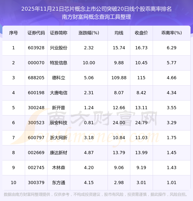 2025年11月21日芯片概念上市公司突破20日線個股乖離率排名