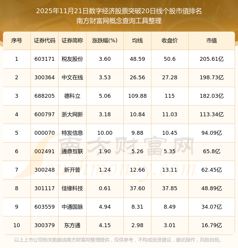 根據(jù)南方財富網(wǎng)概念查詢工具數(shù)據(jù)統(tǒng)計,截止2025年11月21日收盤,數(shù)字經(jīng)濟(jì)股票共有10只個股收盤價向上突破了20日線。其中市值較大的個股有稅友股份、中文在線、德科立等,市值分別為205.61億、198.73億、182.03億。