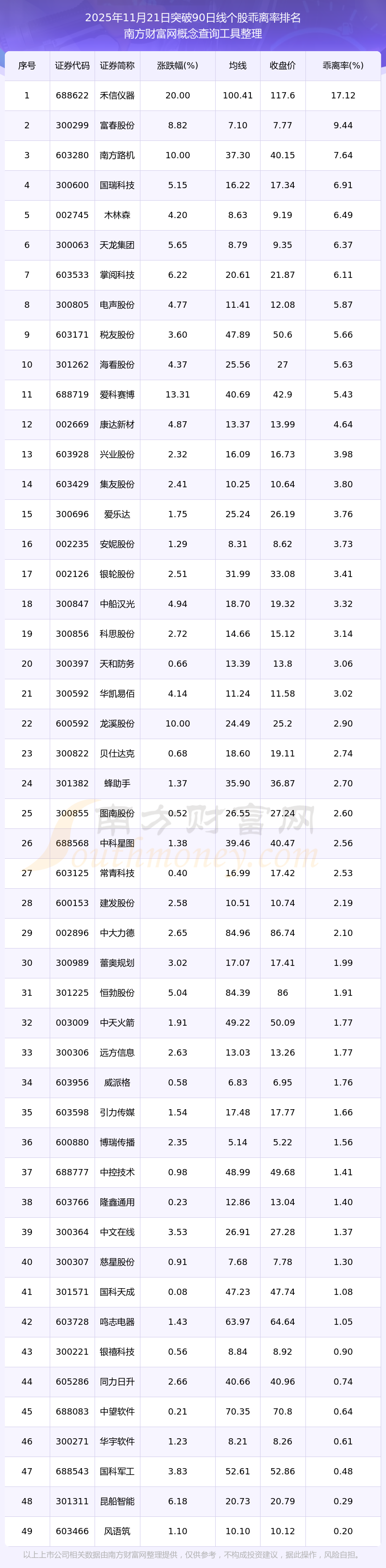 2025年11月21日突破90日線個(gè)股乖離率排名