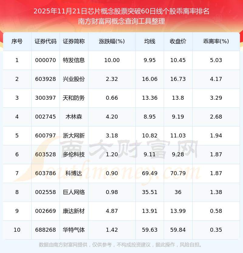 根據(jù)南方財富網(wǎng)概念查詢工具數(shù)據(jù)統(tǒng)計,截止2025年11月21日收盤,芯片概念股票共有10只個股收盤價向上突破了60日線。其中乖離率較大的個股有特發(fā)信息、興業(yè)股份、天和防務等,乖離率分別為5.03%、4.17%、3.29%。