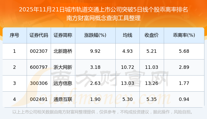 2025年11月21日城市軌道交通上市公司突破5日線個(gè)股乖離率排名