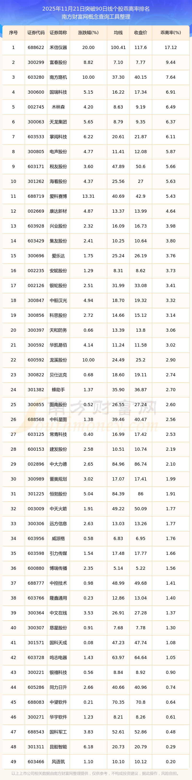 根據(jù)南方財富網(wǎng)概念查詢工具數(shù)據(jù)統(tǒng)計,截止2025年11月21日收盤,共有49只個股收盤價向上突破了90日線,其中乖離率較大的個股有禾信儀器、富春股份、南方路機、國瑞科技、木林森等,乖離率分別為17.12%、9.44%、7.64%、6.91%、6.49%。