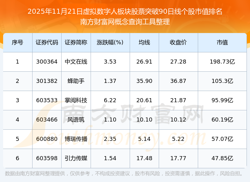 2025年11月21日虛擬數(shù)字人板塊股票突破90日線個股市值排名
