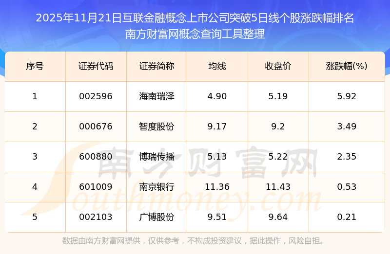 2025年11月21日互聯(lián)金融概念上市公司突破5日線個股漲跌幅排名