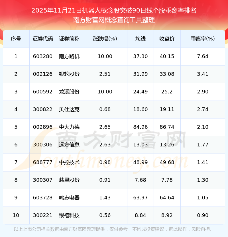 根據南方財富網概念查詢工具數據統(tǒng)計,截止2025年11月21日收盤,機器人概念股共有11只個股收盤價向上突破了90日線。其中乖離率較大的個股有南方路機、銀輪股份、龍溪股份等,乖離率分別為7.64%、3.41%、2.90%。