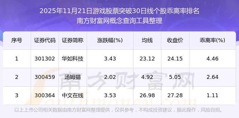 根據(jù)南方財(cái)富網(wǎng)概念查詢工具數(shù)據(jù)統(tǒng)計(jì),截止2025年11月21日收盤,游戲股票共有3只個(gè)股收盤價(jià)向上突破了30日線。其中乖離率較大的個(gè)股有華如科技、湯姆貓、中文在線等,乖離率分別為4.46%、2.64%、1.11%。