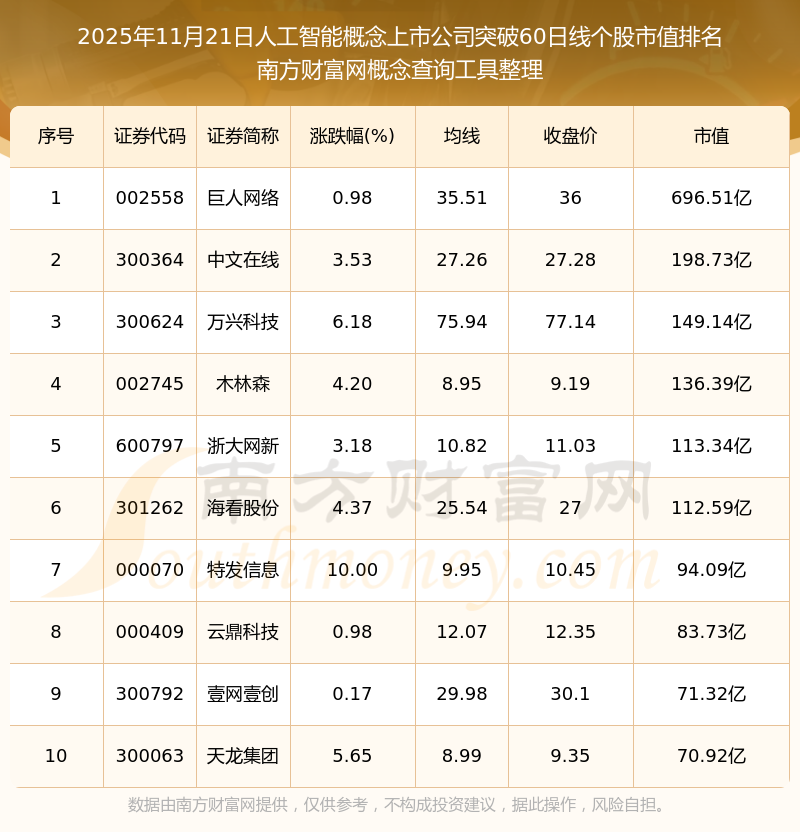 2025年11月21日人工智能概念上市公司突破60日線個股市值排名